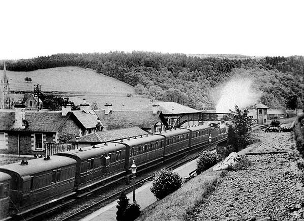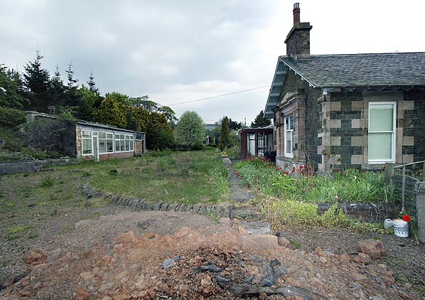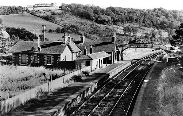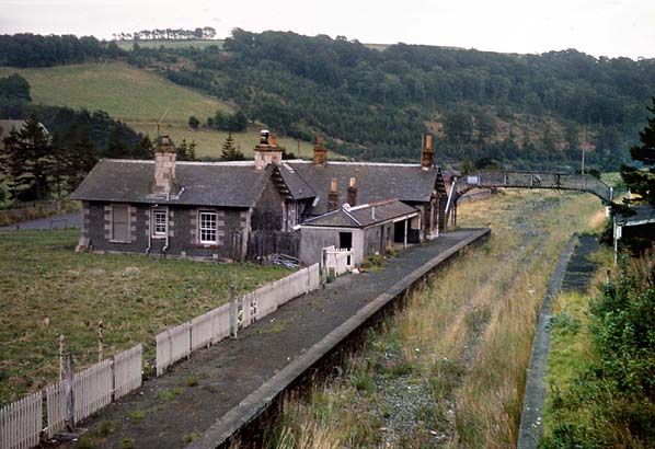 Stow was the station for Lauder until the branch was opened to that town on 2 July 1901; it was shown as 'Stow for Lauder' in some timetables. (including the Bradshaw below). The station had two facing platforms with the main stone buildings at the south end of the up platform. These buildings were more ambitious than at the other minor stations on the route. The two single-storey ridge-roofed structures presented gable-ends to the platform, with distinctive overhanging roofs. The southern structure contained the booking office, reached through gabled main entrance on the forecourt – at right angles to the platform - again with an overhanging roof; its shallow bay window, flanked by pilasters and crowned with a pediment, added dignity to the platform elevation. The northern structure (accommodation for the stationmaster) was recessed from the platform, connected to the southern structure by a short single-storey element with a ridged roof parallel to the platform. A hipped-roofed waiting shelter adjoined the southern structure, filling most of the gap in front of the recessed stationmaster’s quarters. The shelter was open-fronted, with an enclosed waiting room in the northern end of this building.