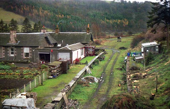 Two miles south of the summit in the 'middle of nowhere' the NBR built what was to become one of the most famous junction stations in Britain in the heart of the Lees Bog. Prior to the railway, apart from a remote shepherd’s bothy, there were no buildings or inhabitants in the area, but the railway brought its own community in the form of Riccarton railway village comprising terraced housing, a shop on the station platform, a school and a three-road engine shed with room for six locomotives; a two-road carriage shed, two signal boxes, a gas plant, turntable and coaling facilities were also provided. At Riccarton, the line made a junction with the Border Counties line extension running through Reedsmouth and Bellingham to the Tyne Valley line at Hexham.