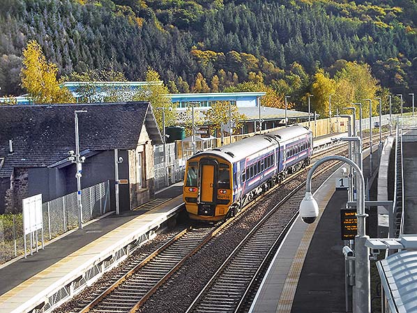 ![]() Stow station looking south from the footbridge. On 21 October 2015 the15.08 departure for Galashiels and Tweedbank is formed of Class 158 DMU 158 726. Part of the building of the original station is to the left of the train. The large modern building behind it is Stow Primary School. Photo by Alan Young