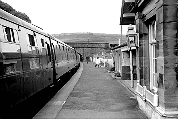 The 14-55 (2M52) train from Edinburgh Waverley to Carlisle waiting at Stow station in July 1966.