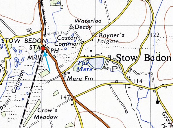 Notes: Stow Bedon station was six miles north of Roudham Junction where the branch to Swaffham left the Thetford to Norwich main line. It was 2¾ miles south of Watton. It lay in an agricultural and wooded landscape where the Watton to Norwich road (A1075) crossed the railway about a mile and a half from the small village whose name the station carried. The Ordnance Survey 25in maps of 1882 and 1905 show the area around the station and the station name as Stowbedon as does the modern-day 1:25,000 series map. On the same maps the village name is shown as two words. The station nameboards read Stow Bedon.