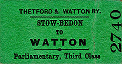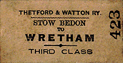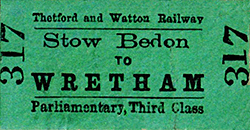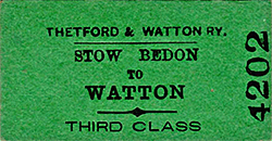 As regards tickets issued for travel, Mr T C F Vollacott wrote a short history of the two railways. He asserted that he did not know whether the Watton and Swaffham company had ever issued its own style of ticket: all that he found bear the name of the working company. Several distinct ticket types were issued: all were standard ‘Edmondson’ size. 1st Class singles were white, 2nd rose, 3rd green and ‘parliamentary’ buff coloured. 3rd class returns were green and buff. Early tickets had serial number and date on the face, right and left sides respectively: later ones had the serial number twice on the face and the date on the back.