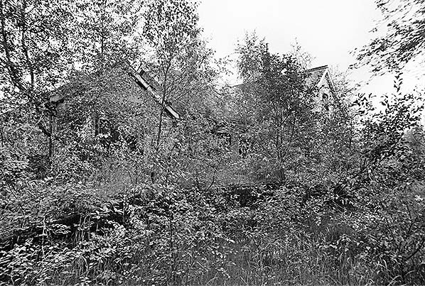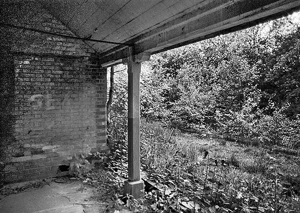 ![]() Looking out at the overgrown track bed from the verandah in front of the booking office at Stow Bedon station in June 1975.