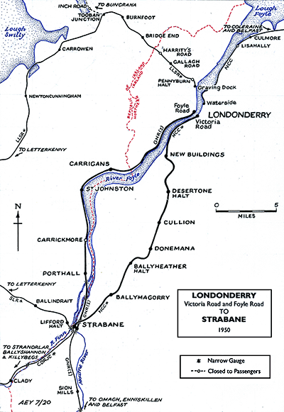 After the partition of Ireland into two separate countries in 1921 (Northern Ireland and The Irish Free State) the CDR system found itself located within two separate countries with all of the difficulties that imposed. Only the Strabane – Londonderry Victoria Road line lay wholly within one country, Northern Ireland.