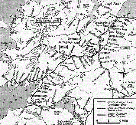 The S&L line, which was the last narrow gauge line to be built in Ireland, was worked from the start by the CDR. With the opening of the S&L the total route mileage operated by the CDR had become 124½ miles (see the 1915 Railway Clearing House map to the right which shows the lines at Strabane as they were after the Letterkenny branch had opened).