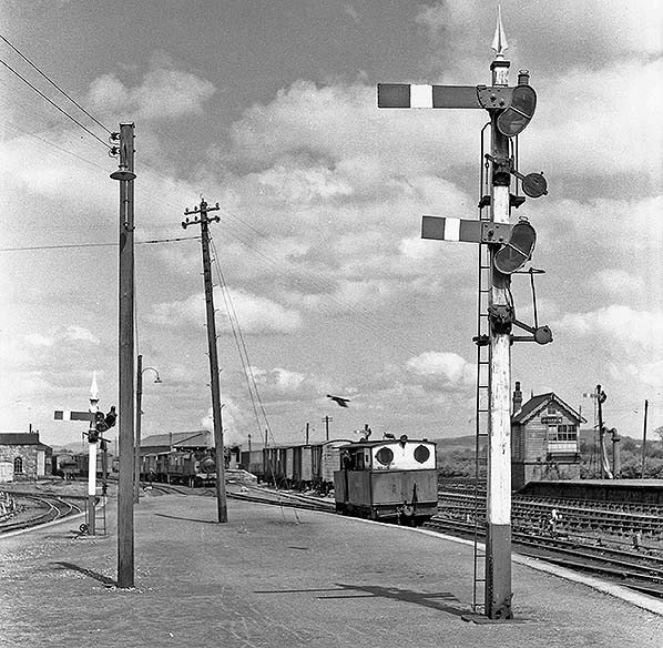 Copyright photo from Colour Rail ![]() The CDR shunting locomotive number 11 ‘Phoenix’ at the south end of Strabane CDR station on 20 August 1958. The GNRI Strabane station can be seen in the background. Railcar A is standing at the down platform at the GNRI station. This railcar was introduced to the GNRI in July 1932. In 1959 it was used on local passenger services between Strabane and Londonderry Foyle Road. Copyright photo from Colour Rail ![]() Signals at the north end of the Strabane CDR station seen in 1959. The signal to the right was for the Stranorlar platform. Prior to 30 June 1955 the larger signal arm was for the Londonderry Victoria Road branch. The smaller arm was for the engine shed and transhipment shed sidings. At this date the larger arm was controlling a truncated section of the Victoria Road line that had been retained to facilitate shunting. The signal to the left stands at the end of the Letterkenny branch platform. Copyright photo from Ernies Railway Archive ![]() A mixed goods train for Stranorlar is seen departing from Strabane CDR station in 1959 behind class 5 tank engine number 4 'Meanglas'. The CDR goods facilities can be seen to the right of the train. Copyright photo from Ernies Railway Archive A goods train is seen at the Stranorlar platform of Strabane CDR station on 21 August 1959. To its right is a CIE van, in green livery, stabled at the down loop platform of the former GNRI station. It was probably transferring mail to the CDR. Photo by Roger Joanes ![]()