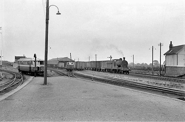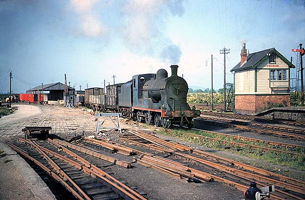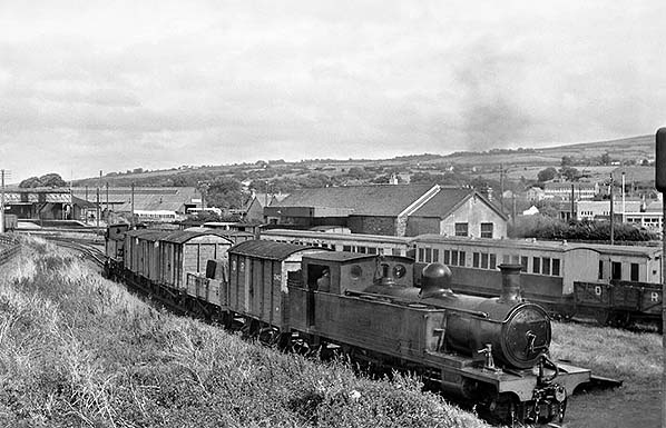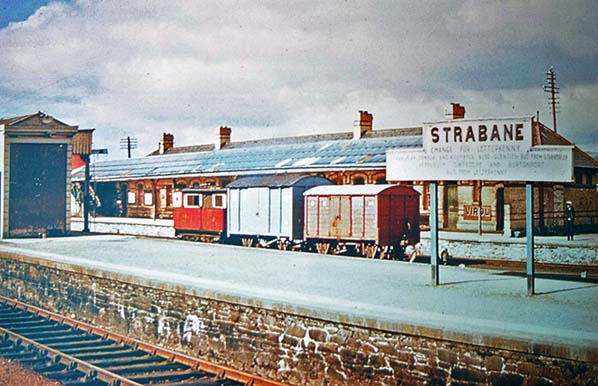 ![]() On 24 August 1959 a freight train for Stranorlar and Donegal is in the process of being prepared at the south end of the Strabane CDR station. The southern goods yard can be seen to the right of the train with the goods store building. In the distance the GNRI Strabane station can be glimpsed. At the head of the train is locomotive number 5 'Drumboe' and attaching wagons at the rear is number 4 'Meanglas'.