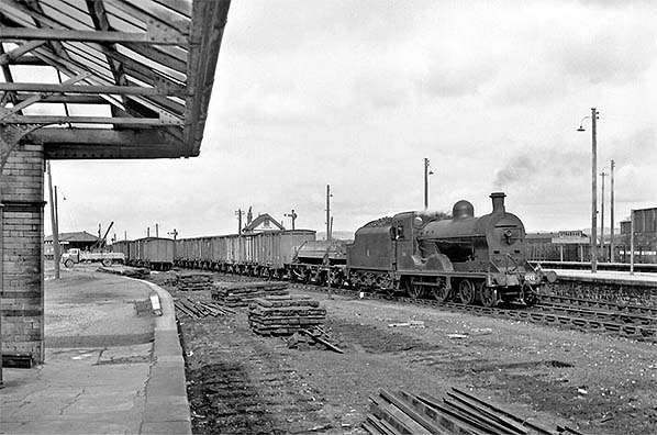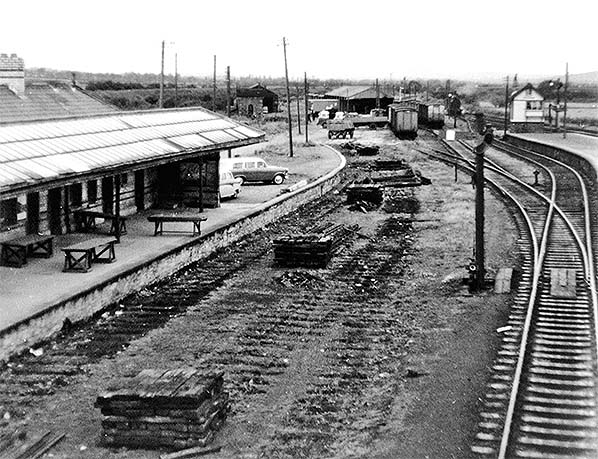 Looking north from the north end of Strabane CDR station on 3 April 1963. At this time narrow gauge rails and sleepers were still stacked within the station area. Coming away from the transhipment shed is UTA U class locomotive number 66 'Meath' (ex-GNRI 201), built in 1948, on a mixed goods train. Since the last CDR goods had been moved by rail on 25 January 1960 the transhipment of goods had only been between lorry and UTA train.