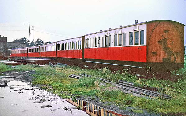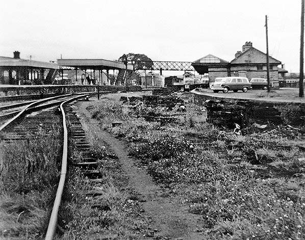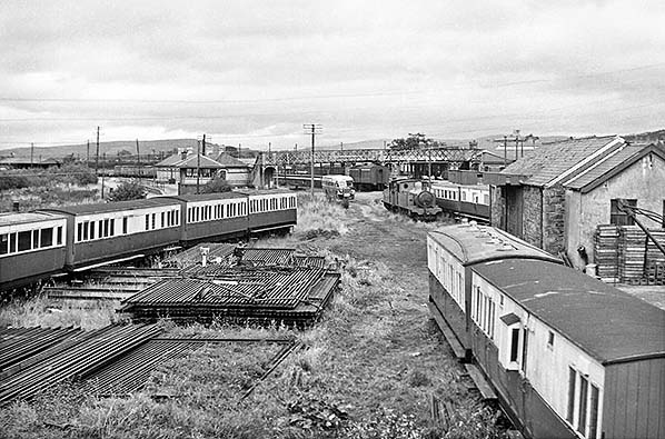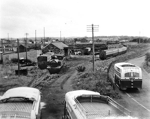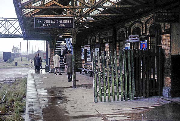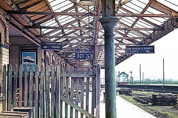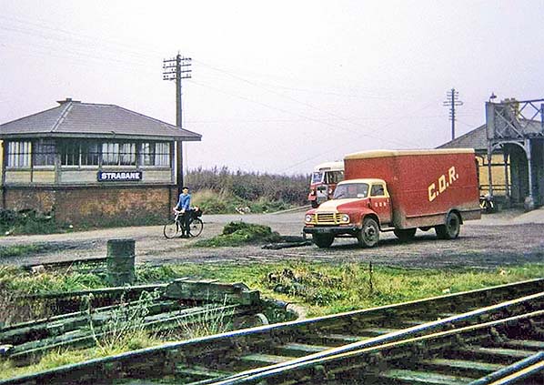 Photo by Roger Joanes from his Flickr photostream ![]() The original platform of the 1894 Strabane CDR station looking south on 24 May 1963. This platform was used by trains that ran via the Stranorlar line to destinations such as Donegal, Killibegs and Glenties. The sign advising passengers of destinations that could be reached from this platform was still present when this view was taken. The track had been lifted a few years earlier. Copyright photo from Ernies Railway Archive ![]() Looking north along the Stranorlar line platform at Strabane CDR station on 24 May 1963. This southern end of the station served the CDR buses at this time. Strabane North Cabin on the former GNRI main line can be seen in the distance. Copyright photo from Ernies Railway Archive ![]() The CDR Strabane station southern goods yard looking south from the station footbridge on 8 August 1963. In the foreground CDR buses can be seen. They were still operating from the CDR station at this time. In the yard locomotives and rolling stock that had been purchased by wealthy American businessman Dr Cox can be seen. Facing north is 'Meanglas' and facing south is 'Drumboe'. The coaches seen to the right are standing on the former main line to Stranrolar. Copyright photo by Michael Bunch from the Donegal Railway Heritage Centre collection ![]() Looking north at Strabane CDR station on 8 August 1963. The 3ft gauge track had been cleared from the station area. To the right is the GNRI station which was still open at this time. In the distance the transhipment sheds can be seen. Copyright photo by Michael Bunch from the Donegal Railway Heritage Centre collection ![]() The two stations at Strabane looking south on 8 August 1963. To the right is the CDR station stripped of its rails but still serving passengers who arrived and departed on buses. The GNRI station is seen to the left. The CDR buses provided a link to the train services which at this time were operated by the UTA. The view clearly shows a station in decline. Copyright photo by Michael Bunch from the Donegal Railway Heritage Centre collection ![]() The Strabane CDR signal cabin of 1908 seen looking west in the autumn of 1963. This cabin was a standard design of the NCC. The CDR passenger station can be seen behind the red van. In the foreground are the standard gauge (5ft 3inch) tracks of the former GNRI main line. The only evidence that here was also a 3ft gauge track is the turntable that can be seen to the left. After rail services had ceased the CDR became a wholly road transport operator. The red van is one of their goods vehicles. Beyond the van one of their buses can be seen. The CDR buses terminated at the station so that passengers could transfer to UTA trains which were still running at this time. The CDR station building with its distictive yellow brick can be seen to the rear of the track, as can part of the footbridge which provided a link to the former GNRI station. Copyright photo by Pete Leigh from the Donegal Railway Heritage Centre collection ![]() In this view from June 1964 CDR locomotives 'Meanglas' (in foreground) and 'Drumboe' are seen in the southern goods yard of the Strabane CDR station. They were awaiting a transfer to the USA that would never come. Photo by Carl Marsden ![]() Another view taken in June 1964 in the southern goods yard at Strabane. This line of coaches has been placed into storage after they had been purchased by wealthy American businessman Dr Cox. Photo by Carl Marsden ![]() Locomotives 'Drumboe' (to the right) and 'Meanglas' (to the left) are seen in the southern goods yard at Strabane in June 1964. The engines had been repainted in the summer of 1963. The coaches seen behind the engines are also in good condition and they would remain so until the GNRI station closed. Photo by Carl Marsden The southern goods yard of the Strabane CDR station looking north from Lifford Road on 9 September 1964. Redundant CDR locomotives, rolling stock and rails fill the yard area. They had all been purchased by wealthy American dentist Dr Cox and were awaiting collection and shipment to the United States. Having purchased all of these items in order to recreate a railway in his home country Dr Cox was unable to afford the shipping costs. The only purchased items that survived were both locomotives and the remains of some coach frames. Those items remained in the yard until 1989. Photo by Roger Joanes from his Flickr photostream ![]()