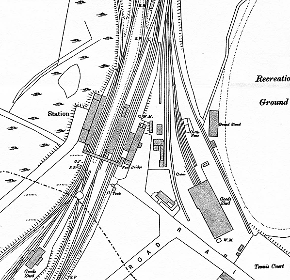 Goods facilities were located to the east of the passenger station and they included a large two road goods shed with loading platforms. There were signal boxes at both ends of the station by 1882.