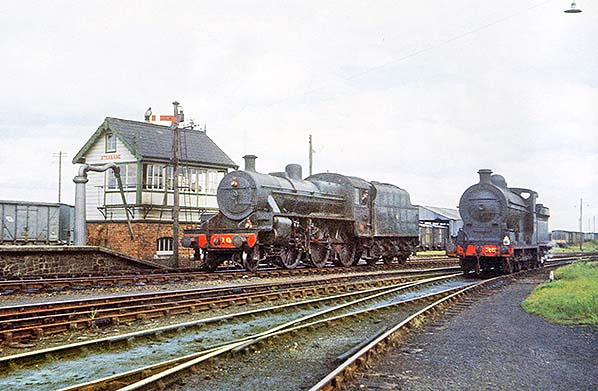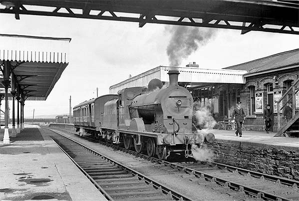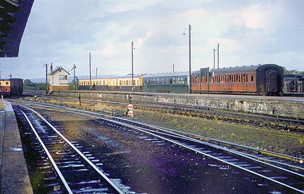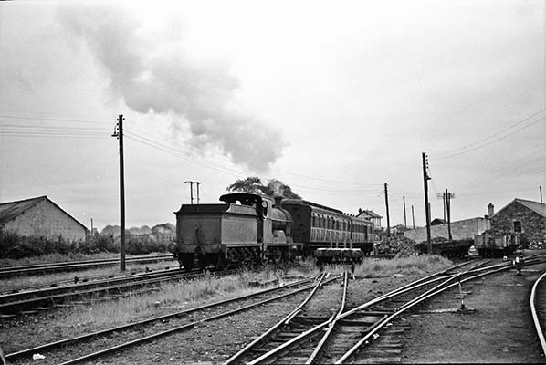 Copyright photo from Ernies Railway Archive ![]() Looking north at the north end of the former GNRI Strabane station in 1959 from the CDR platform. Departing from the station for Londonderry Foyle Road is an AEC railcar towing an ex-GNRI coach. The railcar is wearing a mixed livery. The first two coaches are in the original GNRI railcar livery whilst the third wears UTA green. The coach is in its original GNRI mahogony coach livery. To the far left at the end of the CDR platform the shunting engine 'Phoenix' can be seen. Photo by John Landford ![]() A view looking south from the Strabane CDR station on 31 July 1959. The GNRI sidings are to the left and stabled on one of them is a UTA 4-4-0 U class locomotive number 65 'Lough Melvin' (ex-GNRI 200) with two coaches. The engine was built in 1915 and was withdrawn in October 1961. The train was most likely to have been a local service to Londonderry Foyle Road awaiting access to the down platform. The narrow gauge lines of the CDR can be seen in the foreground. Copyright photo from Ernies Railway Archive ![]() In August 1961 a southbound passenger service prepares to depart from Strabane. At the head of the train is UTA 4-4-0 S class locomotive number 61 'Galtee More' (ex-GNRI 173). The engine was built in 1913 and withdrawn in April 1964. This engine was the only original UTA S class never to be painted into the company's black livery. Copyright photo fron Colour Rail ![]() Strabane station looking north on 3 April 1963. Standing at the up platform is the Londonderry Foyle Road to Omagh service. At the head of the train is UTA 4-4-0 U class locomotive number 67 'Louth' (ex-GNRI number 202). The engine was built in 1948 and withdrawn in May 1965. Photo by Roger Joanes from his Flickr photostream ![]() In 1963 a group of young people on a 'Pioneer' outing pose for the camera towards the northern end of the down island platform of Strabane station. The 'Pioneers' were a catholic organisation for men who renounced alcohol. Photo from from Marie Donaghey-Rocks. ![]() The north end of Strabane station seen on 29 July 1963. The northern end of the down direction island platform can be seen to the left and just beyond it is Strabane North Cabin. The lines closest to the photographer serve the former GNRI goods shed. Two locomotives are seen in the view. To the left is is ex-NCC 2-6-0 W Class Mogal locomotive number 104. This was the last Mogal to be built at Belfast York road workshops in 1942. It was also the very last steam engine to be built on the island of Ireland. To the right is UTA 0-6-0 SG3 class locomotive number 36 (GNRI number 49). This engine was built in 1921 and withdrawn in May 1965. Photo by J D FitzGerald curtesy of Colourpoint ![]() Looking south from the Strabane station footbridge on 10 August 1963. Arriving at the station is the 8.25am Portadown to Londonderry Foyle Road extra service. At the head of the train is UTA SG class locomotive number 44 (ex-GNRI 176). The engine was built in 1915 and was withdrawn in may 1965. It was unusual to see a 0-6-0 goods engine on a passenger train on this line. Photo by Neil Spinks from the Charles Friel negative archives ![]() A view looking north at the former GNRI station at Strabane on 24 September 1963. The footbridge had lost its roof on 16 September 1961 during Hurricane Debbie. Throughout the stations history passengers prefared to use the barrow crossing. UTA Official photograph ![]() The ex-GNRI Strabane station building seen from the forecourt on 24 September 1963. The main entrance to the GNRI side of the station was at this point and it can be seen in this view with its protective awning. UTA Official photograph ![]() On 1 June 1964 UTA 4-4-0 S class locomotive number 60 'Slieve Donard' (ex-GNRI number 172) is seen departing from Strabane on a southbound train. This engine was built in 1913 and withdrawn in May 1965. The engine was painted into UTA black in 1961. Photo by Carl Marsden ![]()