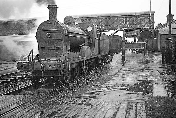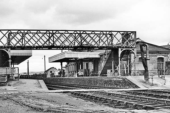 ![]() On a wet day in 1959 UTA 4-4-0 U class locomotive number 64 (ex-GNRI number 196 'Lough Gill' is seen taking on water at the south end of the Strabane station up platform. The locomotive was built in 1915 and was withdrawn in October 1961. In the foreground is the barrow crossing that passengers tended to use despite there being a footbridge.