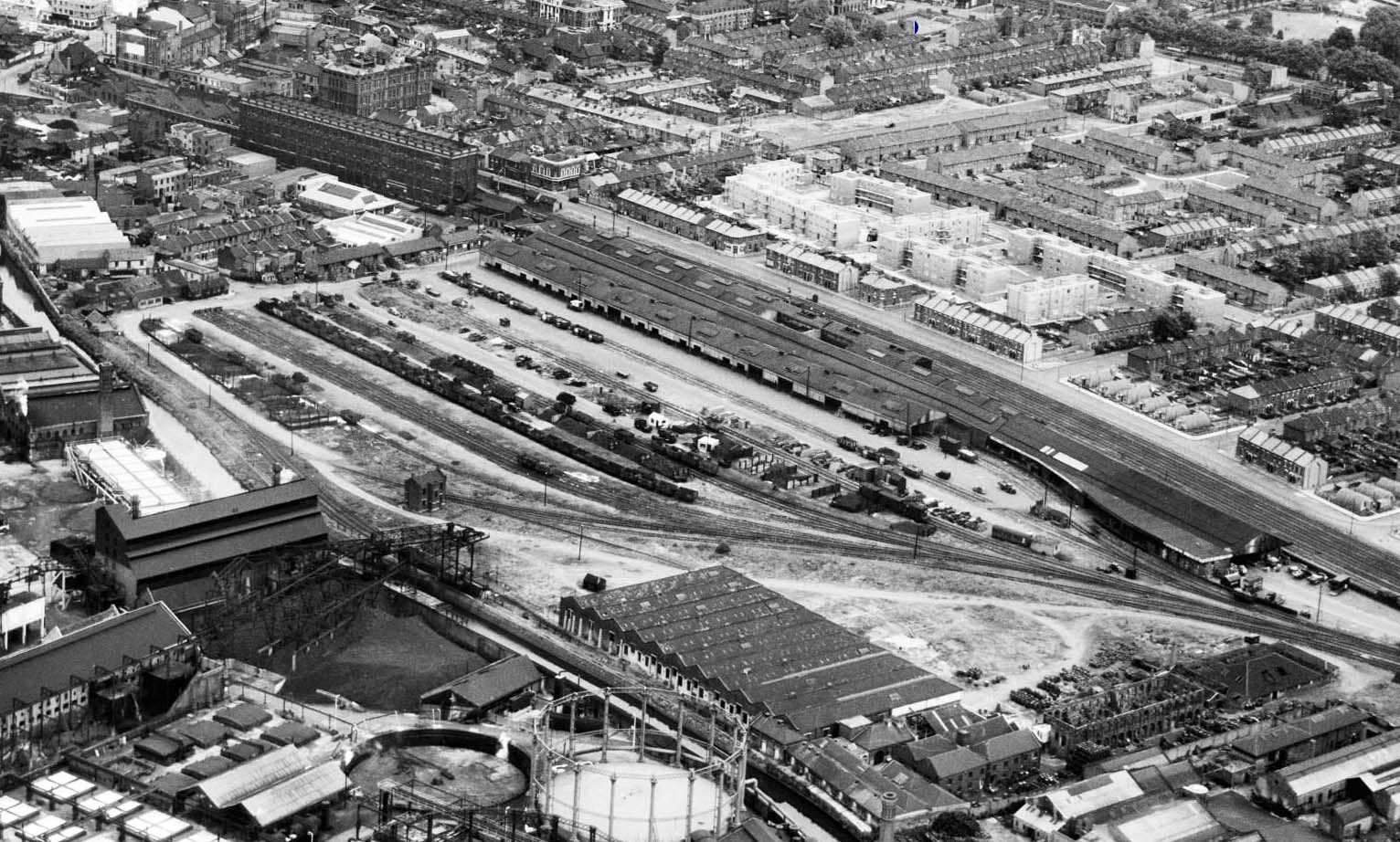 Stratford Market and sidings seen from the air in June 1952. The Channelsea River runs along the west side of the site. The market is located in the long building with vehicle access through the centre shed and two covered sidings either side for loading produce from the tenants’ warehouses located within the shed. Twelve sidings fan out alongside the shed; these will accommodate from 400 to 500 wagons. There are also four cart-ways, varying from 40 to 70ft in width, and carts can back up against 200 trucks at one time. Coal wharves are seen to the left of the market sidings. The large building near the bottom right is the Victoria Stone Works which is served by a single siding. Bottom left is the West Ham gas works with two aerial cableways across the Channelsea River to a terminal in the yard which is served by two sidings. See a picture of the gas works here. Stratford Market's street level building is seen in the top left corner but the station itself is largely obscured by the LNER print works.