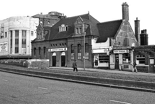 Much has changed in this view of Stratford Market station's street-level building, seen here in November 1975. The building has had a makeover and is now called Coronet House and let out as office accommodation. The Rex cinema has closed, the ladies’ hair stylist has become unisex, the café is still there but Charringtons have gone and their office appears to be empty.