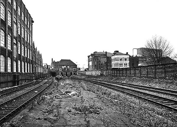 Looking north from Stratford Market's up platform in February 1981. At this time part of the platform surface was in place but badly degraded. The goods lines on the left appear rusty and out of use.