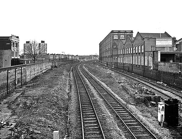 Stratford Market station looking south from the signal gantry in front of the street level building in February 1981. The board on the side of the former LNER printing works says Stratford Workshops.