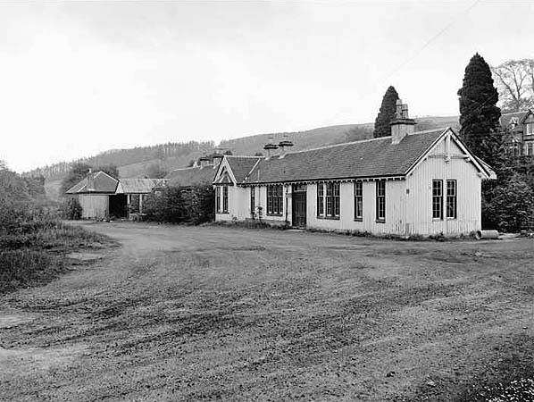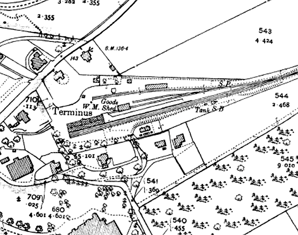 One of these served a timber-faced goods shed with a hipped slate roof, and on the far side of the yard a siding served a cattle dock and pen. There was also a 1ton 10cwt yard crane. A signal box opposite the platform, opened with the line, controlled access to the yard; it was replaced with a ground frame on 27 September 1936 when the line was converted to 'Tyers Occupation Key' and was subsequently demolished; Fodderty Junction box closed on the same date. A water tank stood alongside the passing loop to the east of the signal box.