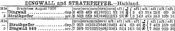 In December 1895 the HR operated seven trains each way over the five-mile long route from Dingwall. The journey time was ten minutes, with no intermediate stops. The first train reached Strathpeffer at 7.50 a.m. and the last at 5.42 p.m. The first departure for Dingwall was at 8.40 a.m. and the last at 8.10 p.m. In July 1922; six HR trains were operated each way. The |