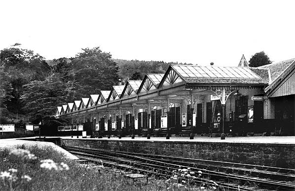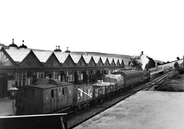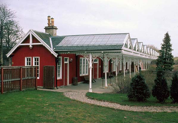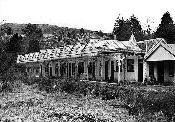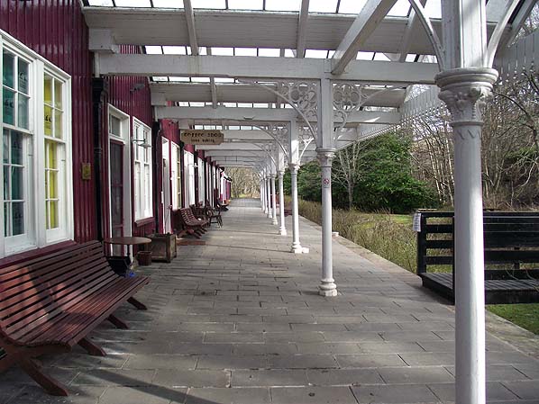 footings has a single gabled canted bay off-centre in its north elevation. There is a continuous glazed gabled canopy with a fretted wooden cornice pruning the full length of the south (platform) elevation supported on 12 cast-iron columns with decorative cast-iron brackets. There are two-light windows in each elevation; multi-pane glazing; a corniced ridge and end stacks with a slate roof. There was a run-round loop to the south of the platform line, and just to the east of the station was the entrance to a goods yard with three sidings running behind the passenger platform.