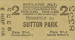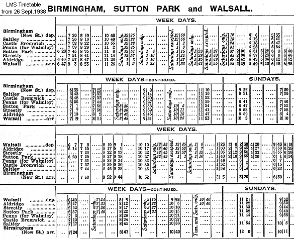 In January 1909 the MR altered the route of most of its trains so that they ran between Walsall and Wolverhampton along an LNWR route that had been created in 1881; this was to avoid a reversal at Walsall. The April 1910 timetable showed Sutton Coldfield as having fifteen up and fourteen down trains on Monday-to-Friday, as shown in the table below. There was an extra up and down train on Saturdays and four in each direction on Sundays.