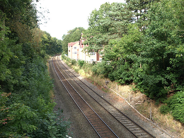Streetly station had three platform faces. The main facilities were located on the up platform (Castle Bromwich direction) and were reached by a driveway from Thornhill Road, which passed over the line on a bridge. The building was a single-storey red-brick structure, and cross-gables with prominent parapets faced each elevation; small windows were set into the gables at ‘first floor’ level to light the interior.