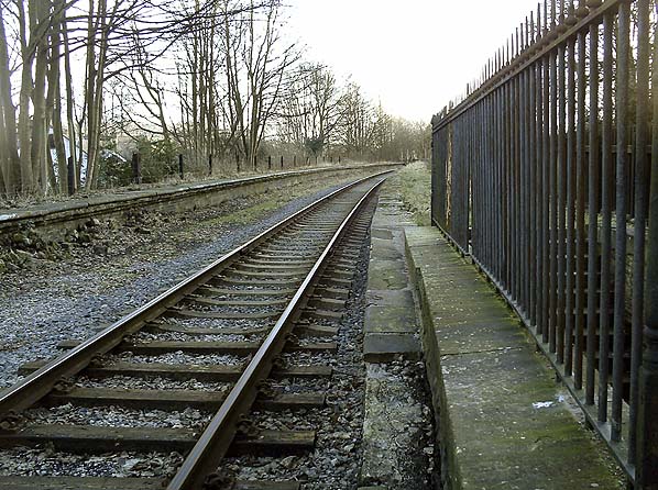 ![]() Looking south at Stubbins station in 2009. Both platforms are extant. To the right of the picture can be seen iron railings which mark the location of the subway which connected the northbound platform, to the right, to the southbound platform, to the left.
