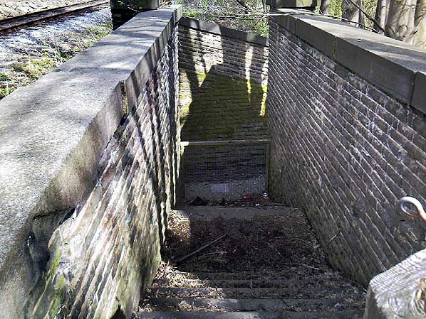 The subway steps at the north end of the 'Up' (southbound) platform at Stubbins station as seen in 2009. Passengeres used these steps to access the 'Down' (Northbound) platform.