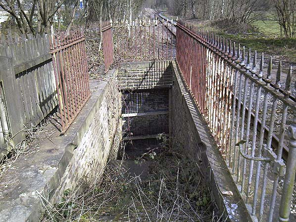 Looking down the subway steps at the north end of the 'down' platform at Stubbins station in 2009. The subway provided a link to the right to the 'up' platform and to the left it ran under the Accrington line to the stations west side exit.
