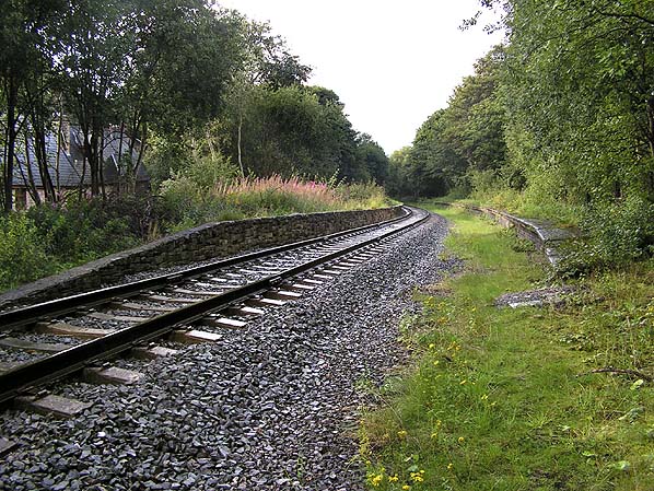 Looking north towards Stubbins station from the site of Stubbins Junction in August 2010. The Accrington and the Bacup lines diverged at this point. The red flowers (Rosebay Willowherb) mark the route that the Accrington line took. The platform to the left, the former northbound platform, did not extend to this point when the station was open. It has been extended across the trackbed of the Accrington line after closure, this line passed to the rear of the northbound platform. The former southbound platform, to the right, remained unaltered. It was always longer