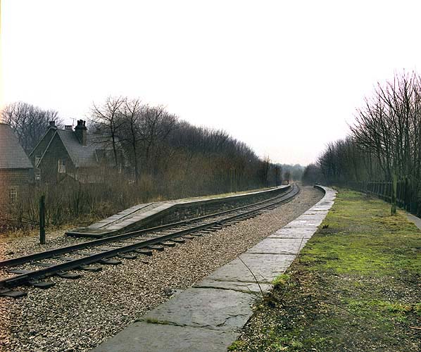 Looking north towards Stubbins station from the site of the Stubbins Junction in 1983. Stubbins Junction was the point at which the routes for Accrington and Bacup diverged. The Accrington line passed behind the platform that can be seen to the left. Stubbins station had no platforms on the Accrington line. The Bacup line passed through the station. The platform to right was the southbound platform that was used by trains travelling towards Bury. The platform to the left was the down (to Bacup) platform until 1970 after which it became bi-directional as the line was singled. It was shorter than the southbound platform. In 1983 the line was officially closed to all traffic.