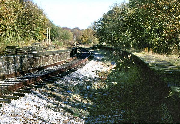 ![]() Looking north at Stubbins station in October 1988. At this time the line was out of use the last train having run through the station in 1982. However work was already ongoing to re-open the line as part of the ELR. Interestingly the ELR extended the former northbound platform at its southern end so that it occupied the trackbed of the former Accrington line. The extension can be seen on the left of the picture. It is the section of platform without a paved edge stone on top.