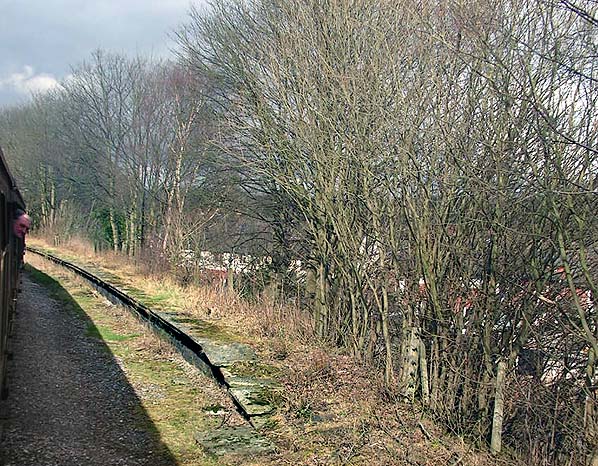 ![]() Looking north at the former southbound platform at Stubbins from a passing train in March 2008. The southbound platform lost its track shortly after the 19th April 1970.