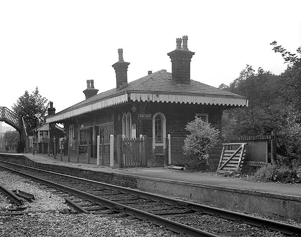 ![]() Looking north at Summerseat station during the summer of 1970. The line had become single track with effect from 19th April 1970 and this picture shows the former down line in the process of being lifted. Discarded sections of rail can be seen in the bottom left of the picture. At this time the building was still standing but it was shortly to be demolished and replaced with a simple bus shelter on the former southbound platform that had become bi-directional.