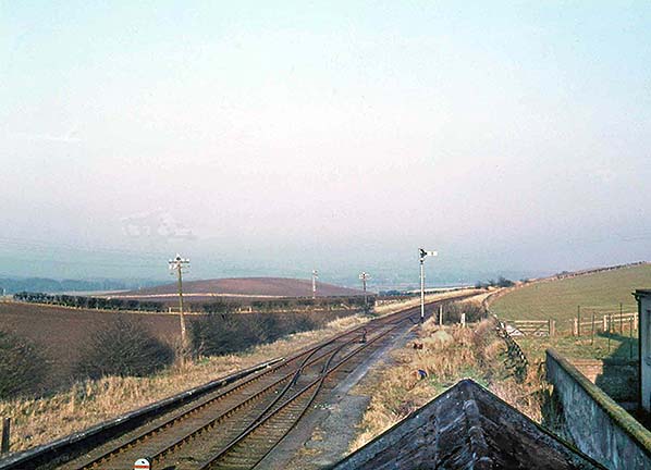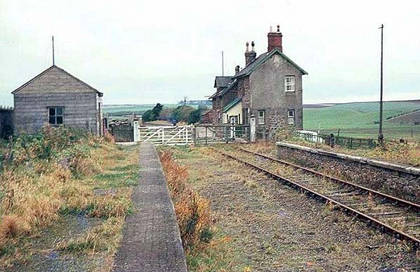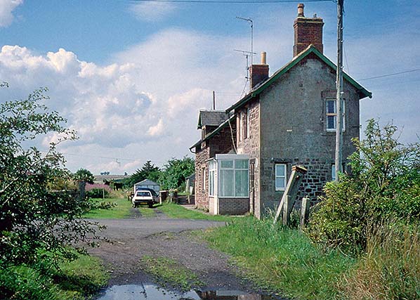 ![]() Sunilaws station on 2 January 1976, looking south-west over the former level crossing, about six years after the rails were removed. The stationmaster’s house on the up side of the trackbed remains in residential use; the lean-to porch has been removed. The platform ramp has been removed and steps have been installed. The goods loading bank is still standing to the left of the trackbed. The crossing gate posts are still in place on the near side of the road and one of the gates has been unceremoniously dumped against the telegraph pole. The station’s post box is still in use.