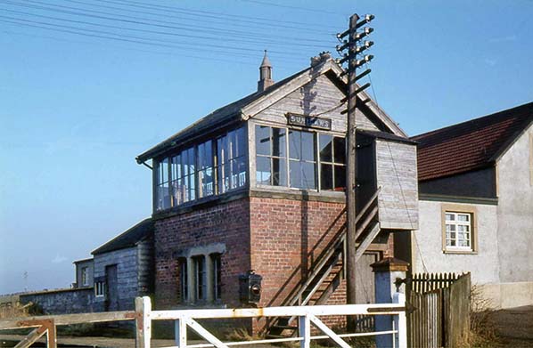 ![]() Sunilaws signal box, looking east from the level crossing, probably in winter 1963-64. The box, an N4 design with a brick base, was constructed in 1901; it was equipped with a McKenzie & Holland 26-lever frame and gate wheel. It was the second box at the station, but little is known of the first, opened c1880, including its precise location. The box seen here would remain in use until complete closure of the line on 29 March 1965.