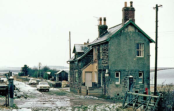 Photo by Morrison Halbert from Roy Lambeth collection / ARPT collection ![]() The railway between Tweedmouth and Kelso closed to all traffic in March 1965, and the following year the down line was removed. Seen here in 1968 the up line is still in place, though disused; it would be removed in 1969/70. The photo is taken from the down platform, looking south-west. The enclosed timber shelter is still in place on the platform but the signal box (which operated until 1965) has gone. Far right the coal siding loading bank is still seen. The crossing gates still yield evidence of the accident when a down train smashed through the left gates which had to be replaced. The stationmaster’s house and up platform are beyond the crossing. The upper storey of the gable has been rendered. The timber lean-to entrance seen on earlier photos is still intact and looks freshly painted.