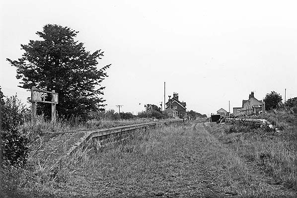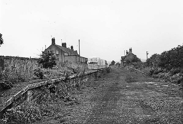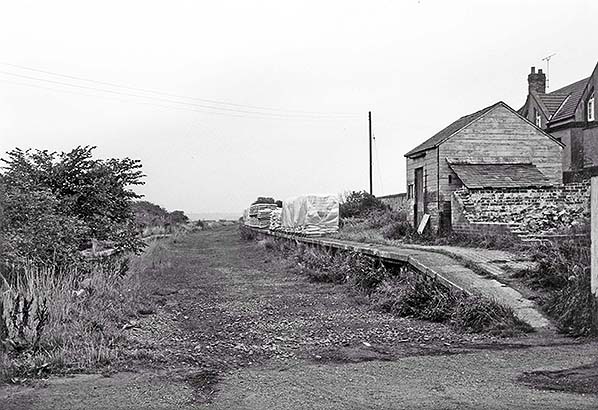 Photo by John Mann ![]() Looking north-east from the old level crossing at Sunilaws station in September 1977. On the right is the former down passenger platform with a timber-built store, and behind it is the row of railway staff cottages. To the left of the trackbed is a goods loading bank. The passenger platforms were staggered either side of the level crossing.