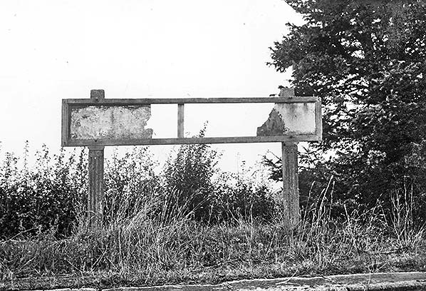 ![]() The stanchions and frame of the up platform running-in nameboard survive at Sunilaws station in September 1977, over 22 years after it closed to passengers.
