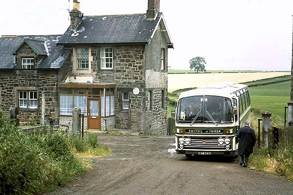Photo by John Mann ![]() Looking north-west at Sunilaws station in June 1978 as a motor coach, far from home, approaches the former level crossing. Three of the old gate posts can be seen. The stationmaster’s house is still in residential use. The new porch / vestibule could have been more sensitively designed: the pale bricks, huge windows and flat roof definitely do not complement the stone-built house.