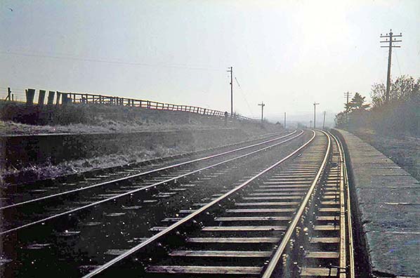 Looking north-east probably in winter 1963-64. The disused down passenger platform is on the near side of the tracks and the platform to the left is a goods loading bank. The up passenger platform is behind the photographer.