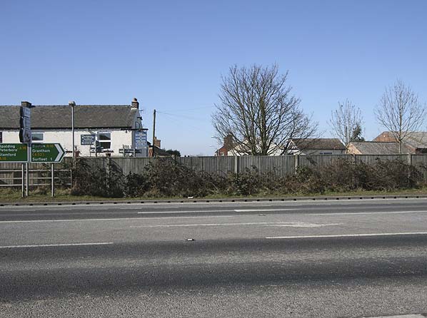 The site of Surfleet level crossing in March 2010. The station is to the right, Station Road straight ahead and the Great Northern Hotel is seen on the left.