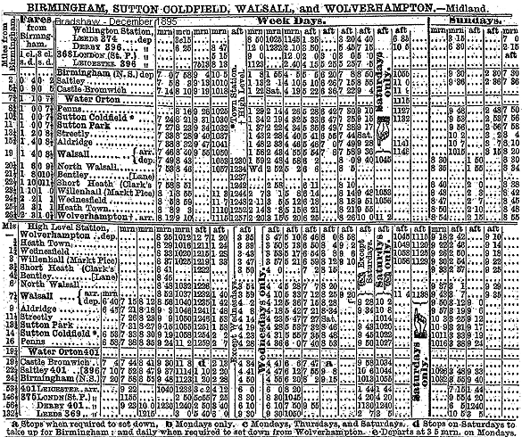In January 1909 the MR altered the route of most of its trains so that they ran between Walsall and Wolverhampton along an LNWR route that had been created in 1881. This was to avoid a reversal at Walsall. The April 1910 timetable showed Sutton Coldfield as having 14 up and 13 down trains Monday-to-Friday, as shown in the table below. There was an extra up and down train on Saturdays and four in each direction on Sundays.