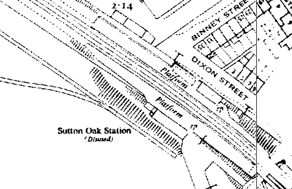 Sutton Oak station first appeared in the public timetable in 1852. It was located to the north of Lancots Lane which passed under the railway. The main facilities were on the up platform (St Helens direction) accessed from a driveway and a path that linked to Lancots Lane. A single storey brick building was located on the up platform that housed a booking office two waiting rooms and toilet facilities.