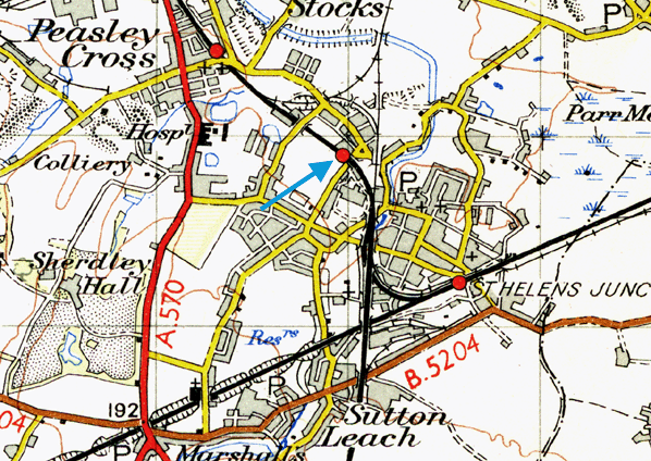 Notes: Sutton Oak was situated on the Widnes and St Helens line which had originally opened on 21 February 1833 as the St Helens & Runcorn Gap Railway (SH&RGR). Built primarily for the movement of coal from the St Helens coalfield to a dock on the river Mersey (Widnes Dock) at the Runcorn Gap the line did carry passengers from its first year of operation, but there were no intermediate stations between the dock and St Helens.