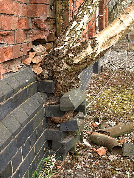 Brickwork damaged by a Silver Birch tree at Sutton Park goods shed on 25 April 2013. Photo by Terry Callaghan