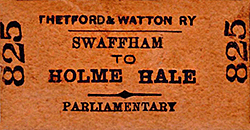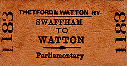 As regards tickets issued for travel, Mr T C F Vollacott wrote a short history of the two railways. He asserted that he did not know whether the Watton and Swaffham company had ever issued its own style of ticket: all that he found bear the name of the working company. Several distinct ticket types were issued: all were standard ‘Edmondson’ size. 1st Class singles were white, 2nd rose, 3rd green and ‘parliamentary’ buff coloured. 3rd class returns were green and buff. Early tickets had serial number and date on the face, right and left sides respectively: later ones had the serial number twice on the face and the date on the back.