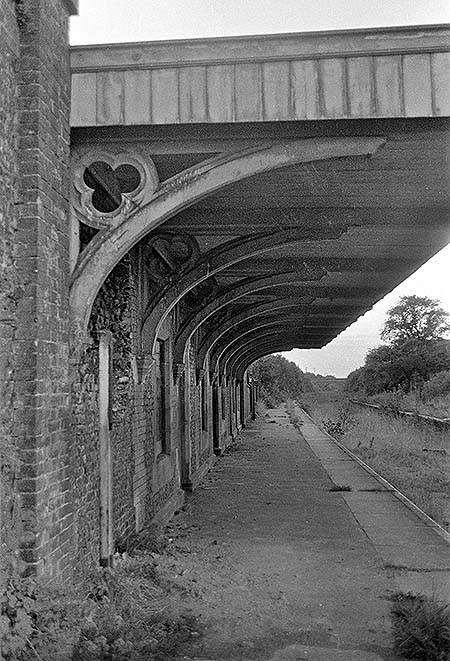 ![]() Looking west under the south platform awning of Swaffham station in October 1975. The huge brackets with trefoil motifs in the spandrels will be noted.