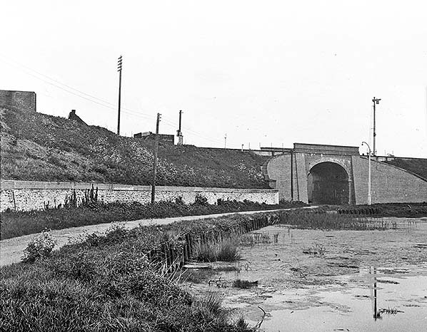 ![]() The bridge over the Sporle Road and Northwell Pool at Swaffham. The junction of the Dereham and Thetford lines is to the right of the image edge and the engine shed behind the photographer on the left. Undated.