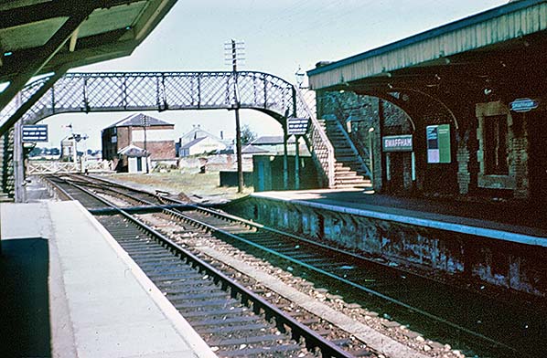 Photo from Duncan Chandler collection ![]() Swaffham station in 1968 looking east from the north (island) platform prior to closure. The main building is to the right and a waiting shelter to the left. BR Eastern Region signage is seen, including a totem and running-in board on the south platform. Until the end the station remains gas-lit.