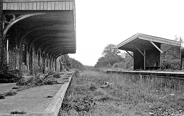 ![]() The disused Swaffham station looking east from the north (island) platform in October 1976.